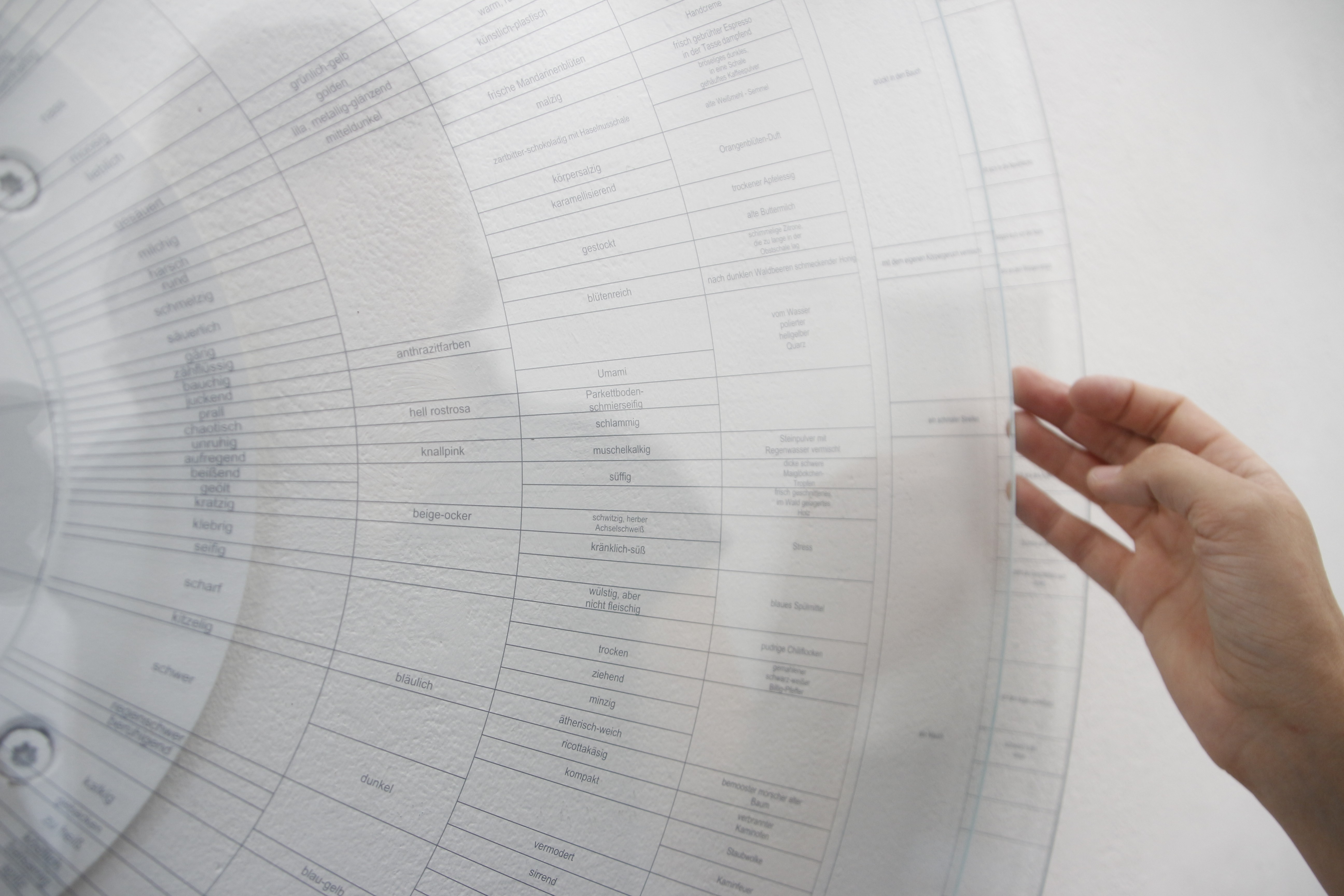 Ich rieche die Semmel dick mit Butter bestrichen und mit Salami belegt, die zwei Reihen hinter mir gegessen wird. Meine Konzentration legt sich auf das Glas, welches ich nun imaginiere. Ich rieche Wüstensand, trockene heiße Luft, ein bisschen Kerosin drückt sich durch, aber da ist hauptsächlich ein türkiser Geruch, umschmeichelt die Nase ganz sanft und trägt etwas Zuckersüßes. Diese Süße ist nicht klebrig, sie hat die Textur von dicken Blütenblättern, die mit dem Finger zerrieben einen Film hinterlassen und den Duft von frischem Quellwasser evozieren.