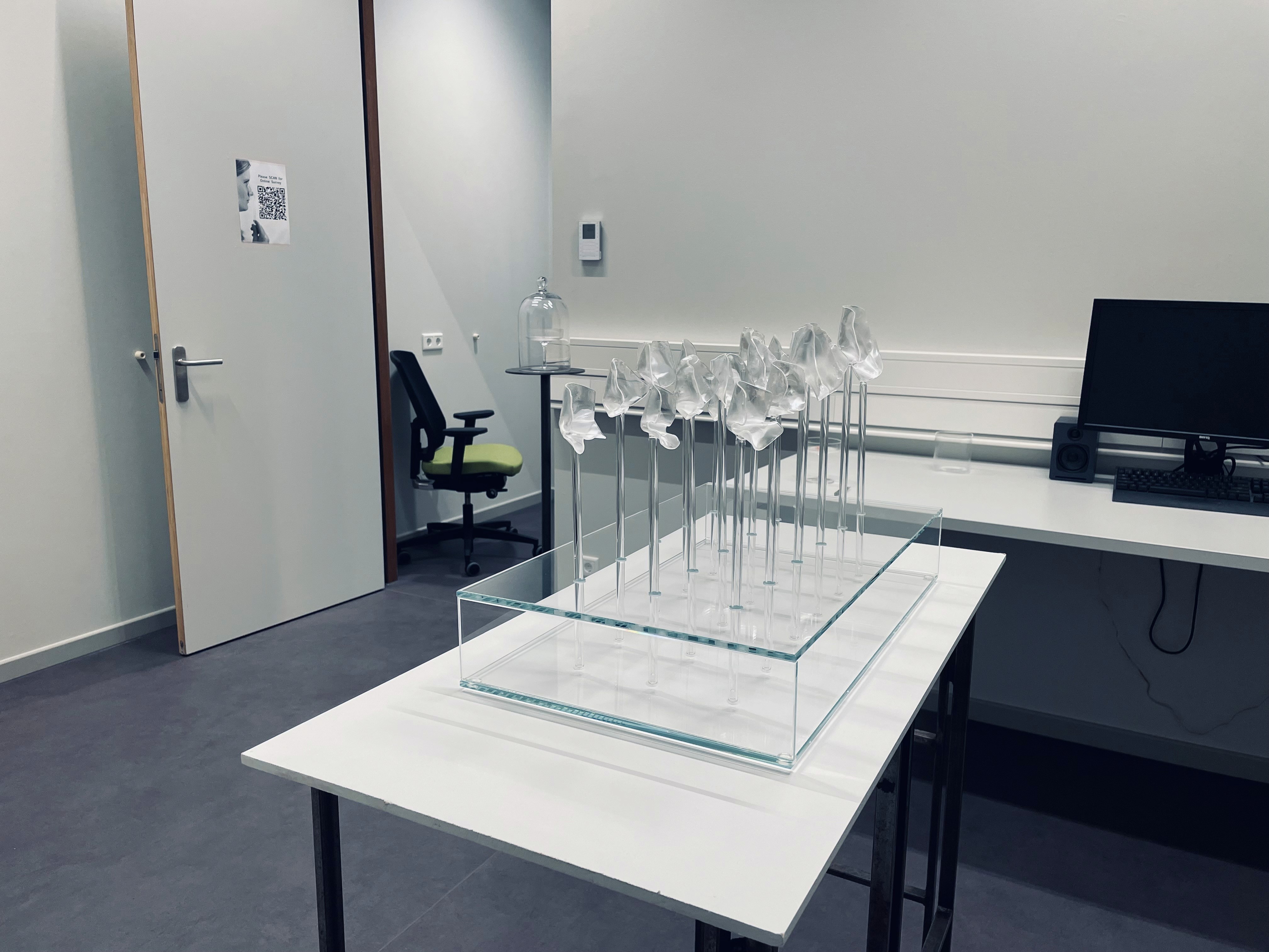 This research investigates how different environments influence people’s ability to imagine smells. We are interested in how artistic and scientific contexts shape the vividness of olfactory imagination. The project introduces a method called “Glass Tastings”, where participants engage in a short-guided performance using the odorless material glass (“glass nose”) as a surface for imagined smells. By comparing a laboratory setting and an art space, we hope to better understand whether artistic contexts promote stronger olfactory imagination, and whether individuals with reduced sense of smell use other senses to support imagination.