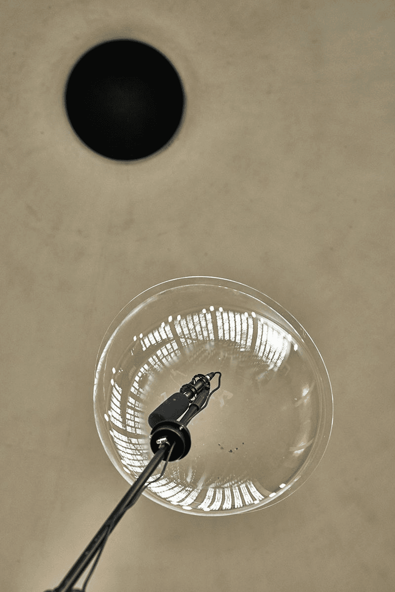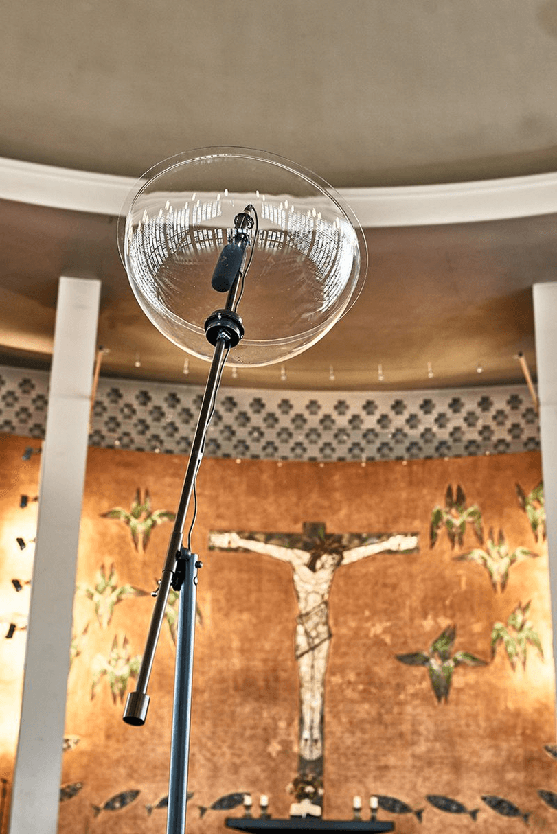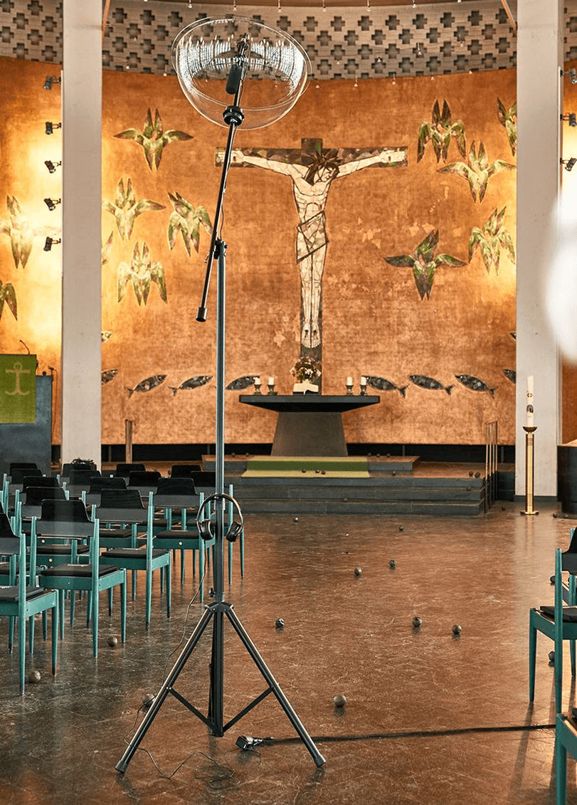 The sculpture responds to the architecture of the church and establishes an audio-visual connection between the bell hole above and the listener below. Its form echoes the aesthetics of a parabolic antenna or microphone - an instrument for focusing sound.