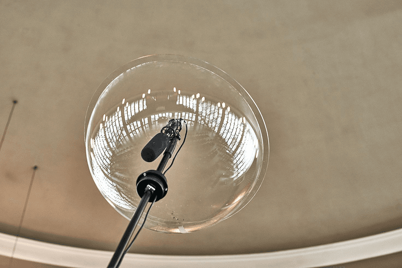 Die Skulptur reagiert auf die Architektur der Kirche und schafft eine audio-visuelle Verbindung zwischen dem Glockenloch oben und den Rezipierenden darunter. Die Form der Skulptur erinnert an eine Parabolantenne oder ein Richtmikrofon - ein Instrument, das Klang fokussiert.