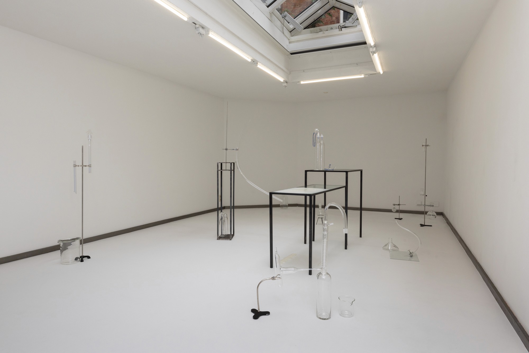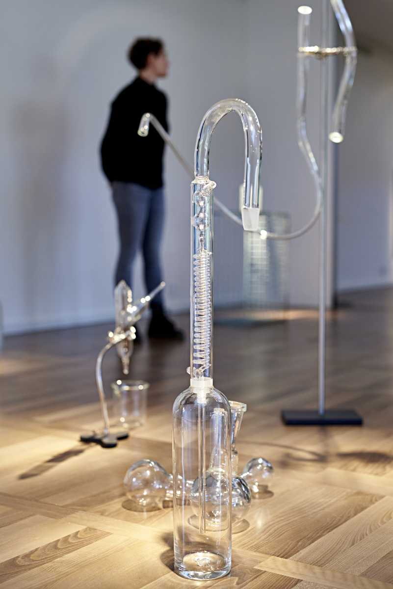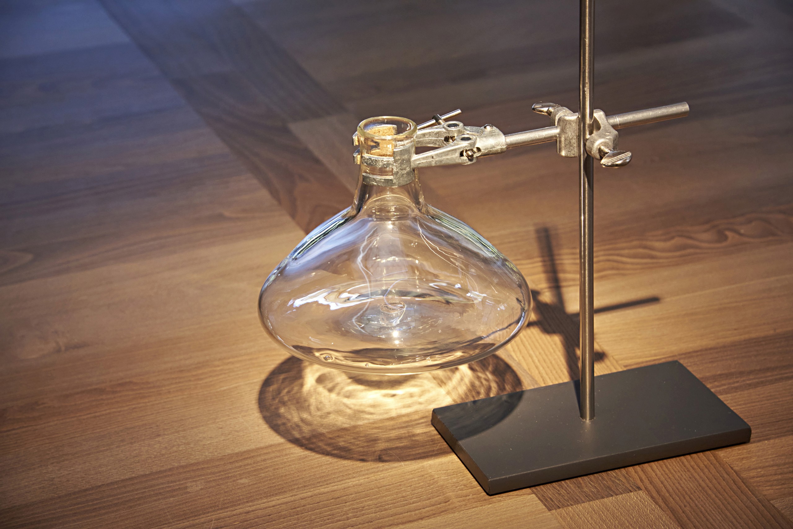 [Distill] the Smell of Glass is a sculptural approach designed to direct the visitor's perception to the liminal space between tangible and intangible experiences and phenomena. The installation constrains of transparent, colorless glass objects, which can visually be understood as laboratory instruments and instruments for distillation and perfumery use. Glass is used primarily as a carrier medium and for laboratory equipment. In her 2013 publication, Dehlia Hannah (p. 27) employs the example of the microscope to illustrate that the perception of scientific instruments as materials or objects is contingent upon their usage. "one no longer sees the instrument itself once one has learned how to see through it”, „[...] instruments, by their very nature, recede into their context of us and thus become transparent and invisible (Hannah 2013, p. 20).