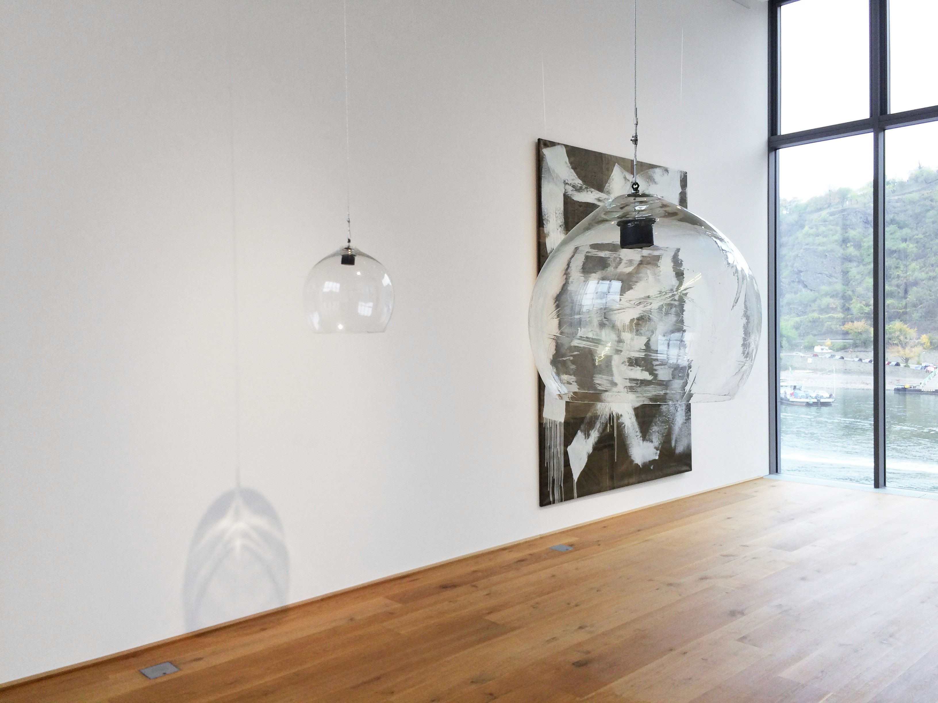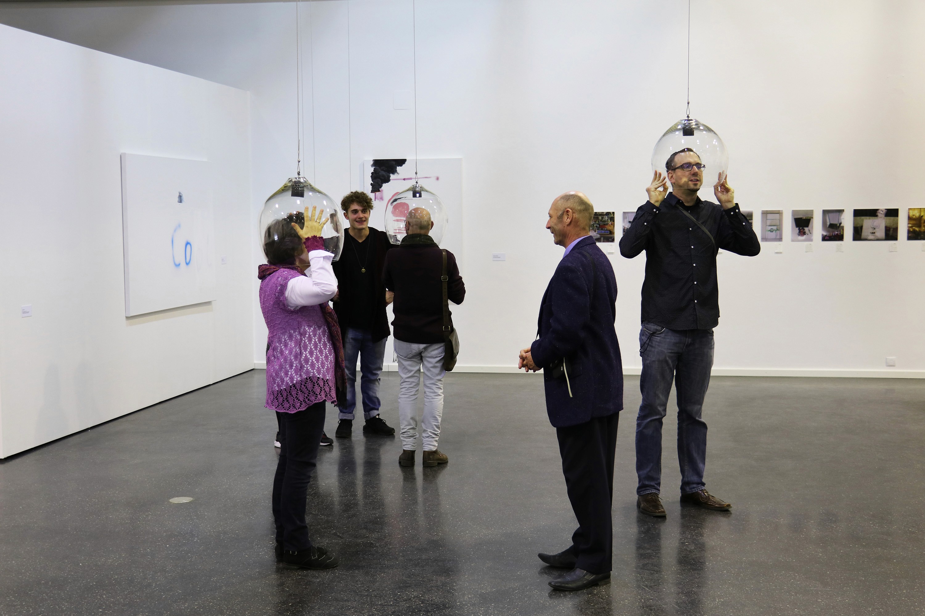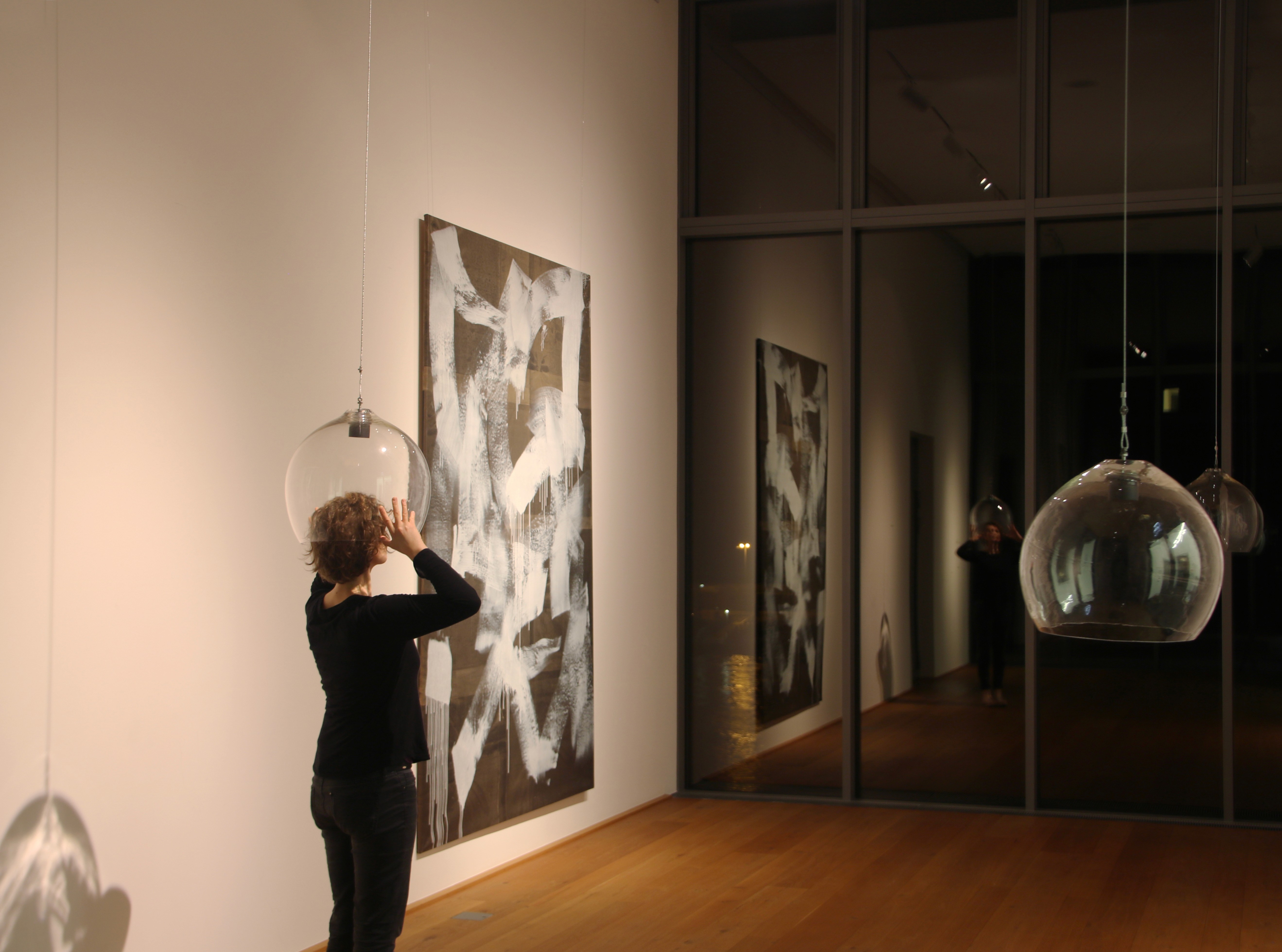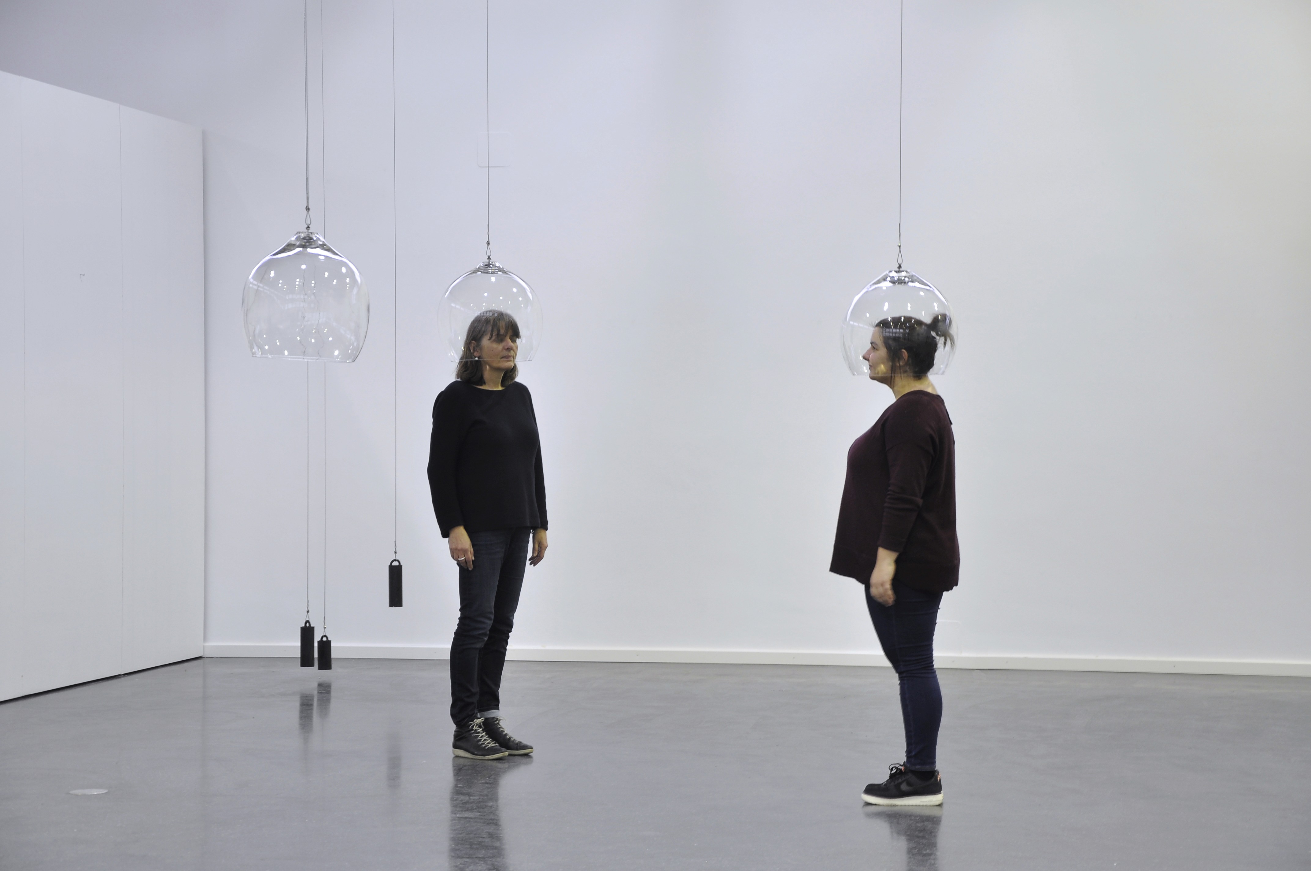 The work engages the embodied self: the body that perceives, yet is separated from its surroundings by the transparent membrane of glass. This material subtly distorts the recipient’s sense of space, amplifying or unsettling what is heard and seen. The installation also draws attention to the sense of smell: each sphere creates an own space, prompting an awareness to the act of breathing and inhaling air and the own body odor. The installation explores the multimodal experience of the senses.