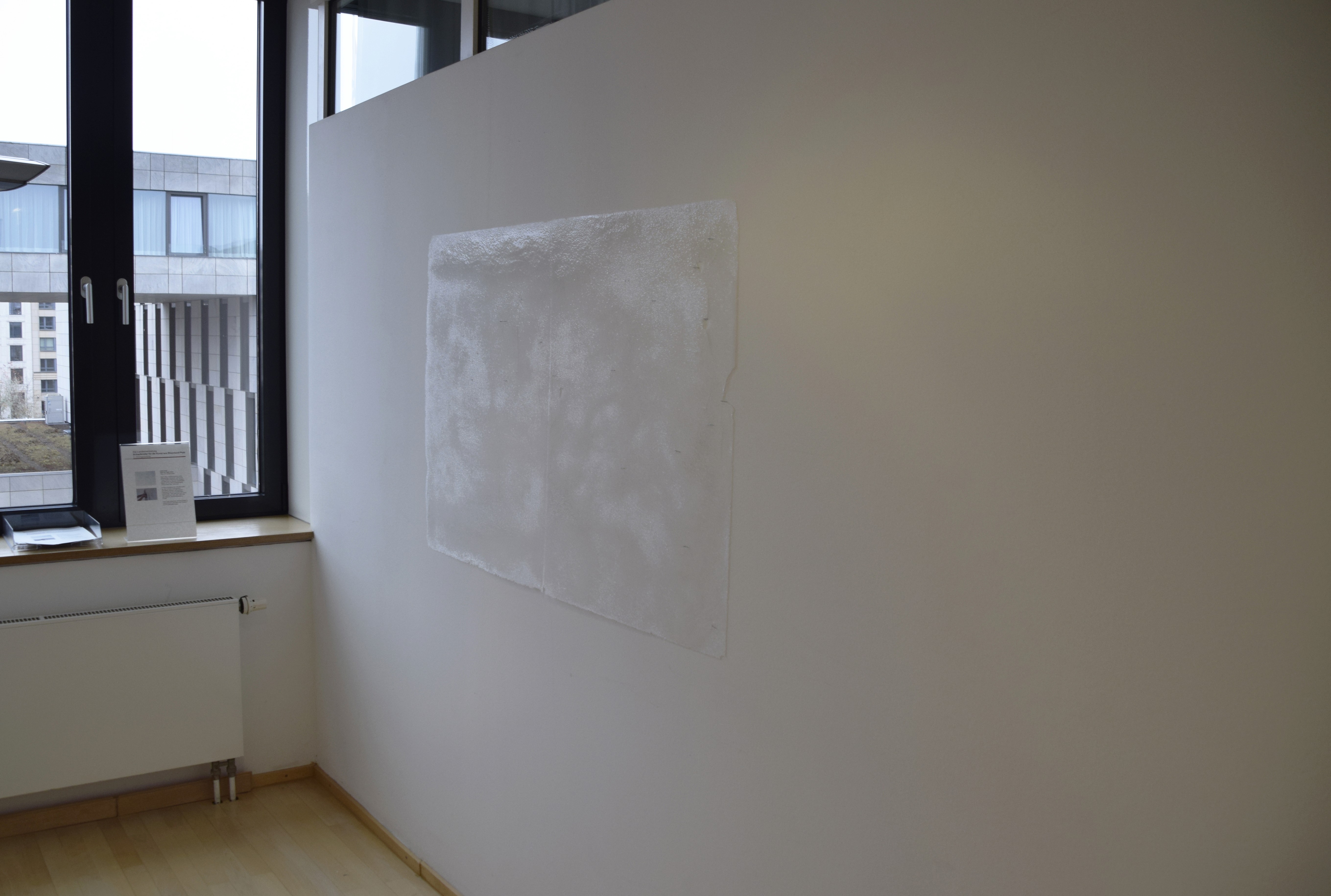 Hold On Tight ist Bild und Performance zugleich: Nach meiner Performance, in der eine in zerbrechliche, in Pate-de-Verre-Technik hergestellte Glasplatte an die Wand getackert wird, bleibt das Bild des zum Teil gebrochenen Glases mit den Tackernadeln an der Wand als neues Bild bestehen.
