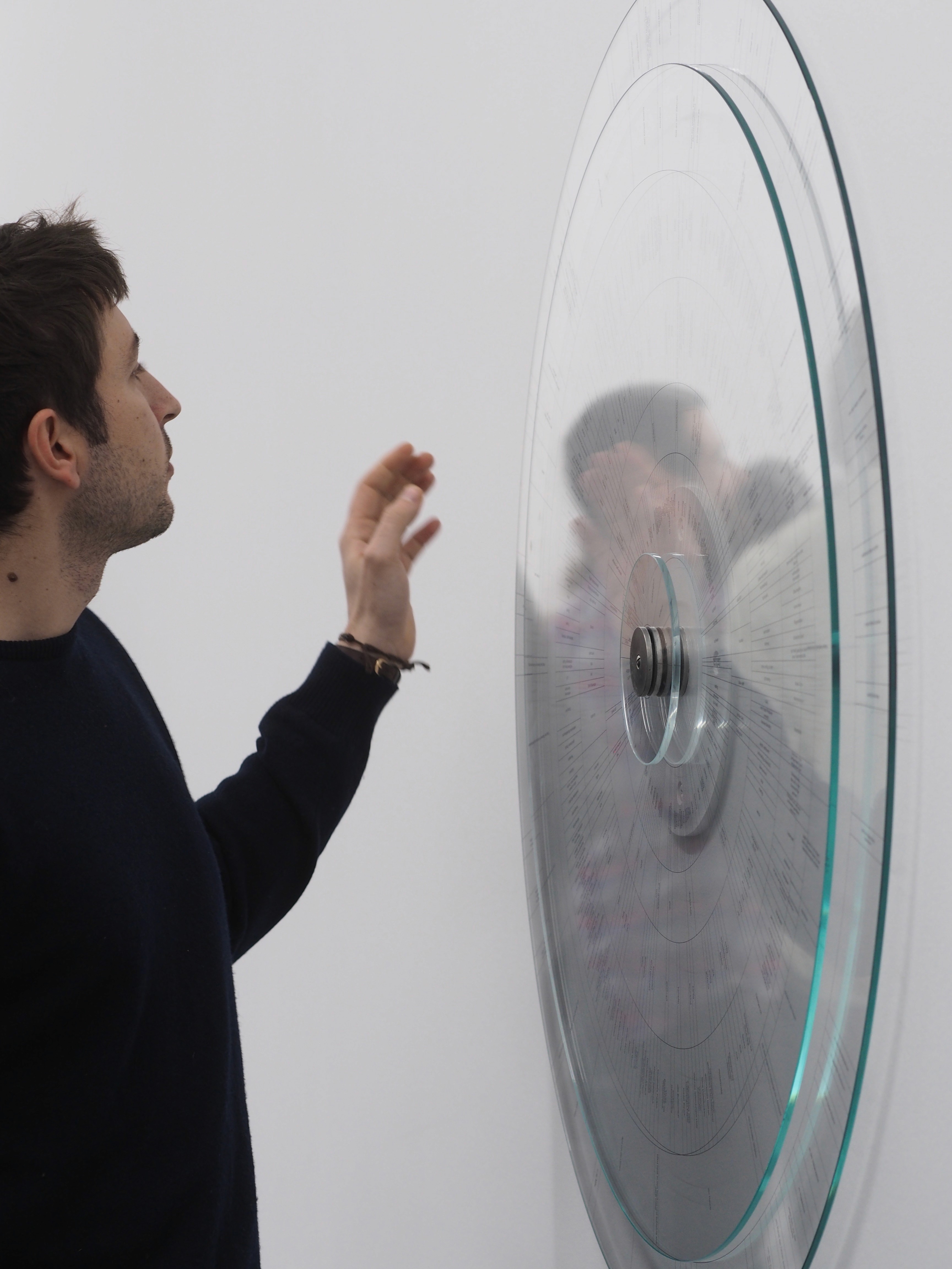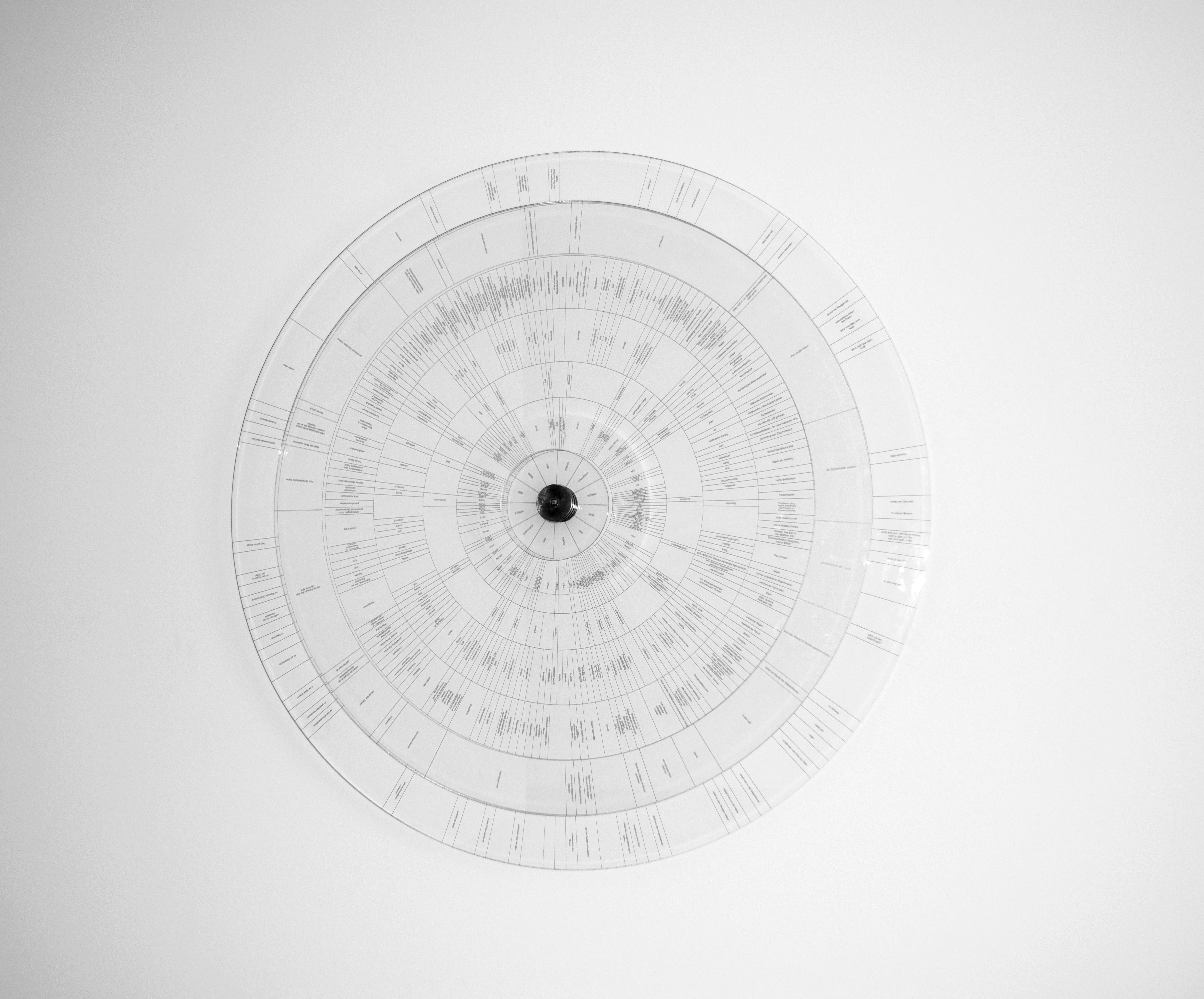 Afterwards, these descriptions were analyzed and categorized according to linguistic criteria. The resulting categories were UV-printed onto three circular glass discs, which can be rotated. Through this participatory engagement, the wheel transforms linguistic data into poetry and imagined smell, inviting viewers to navigate subjective olfactory perception through language, and glass.