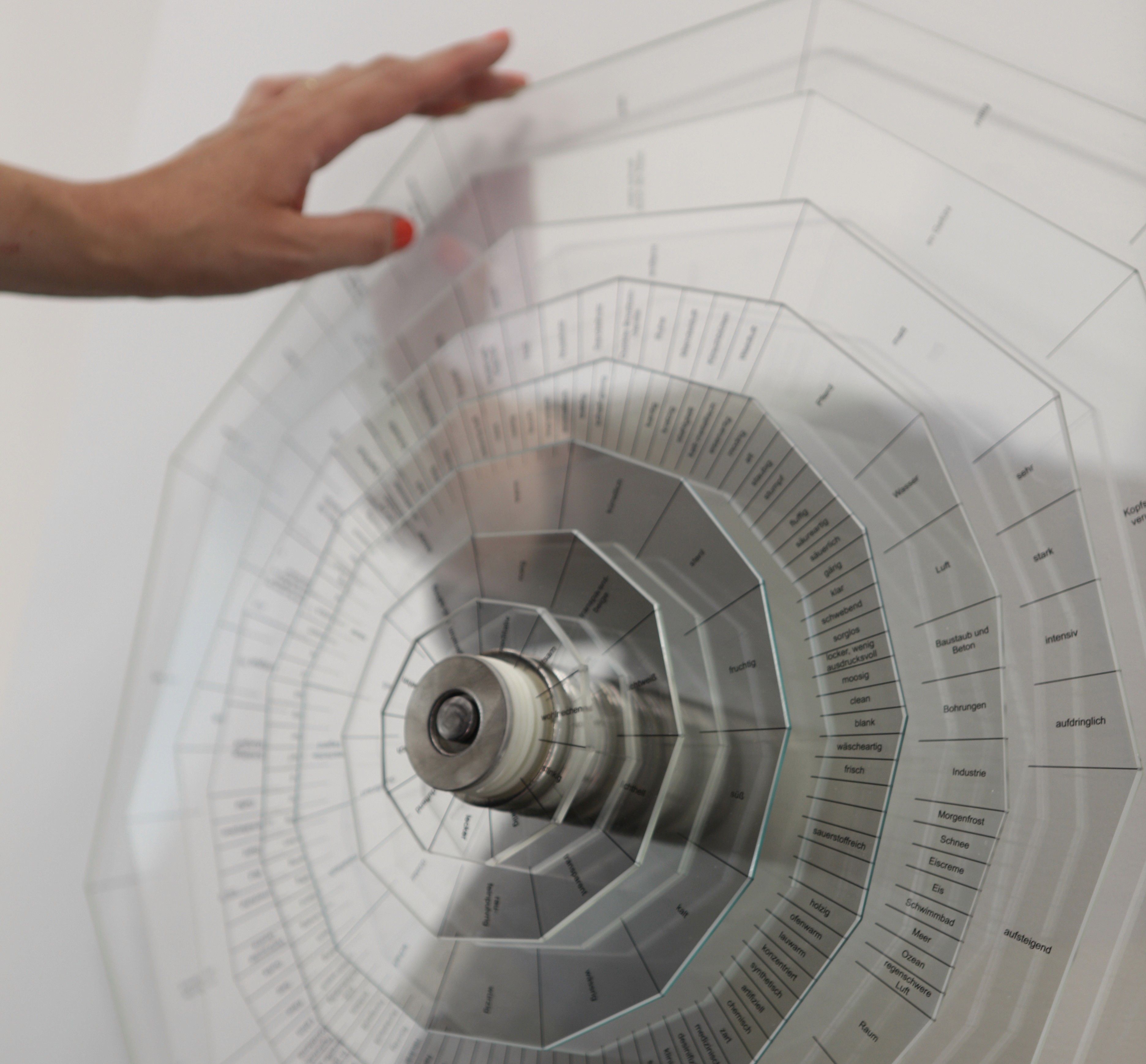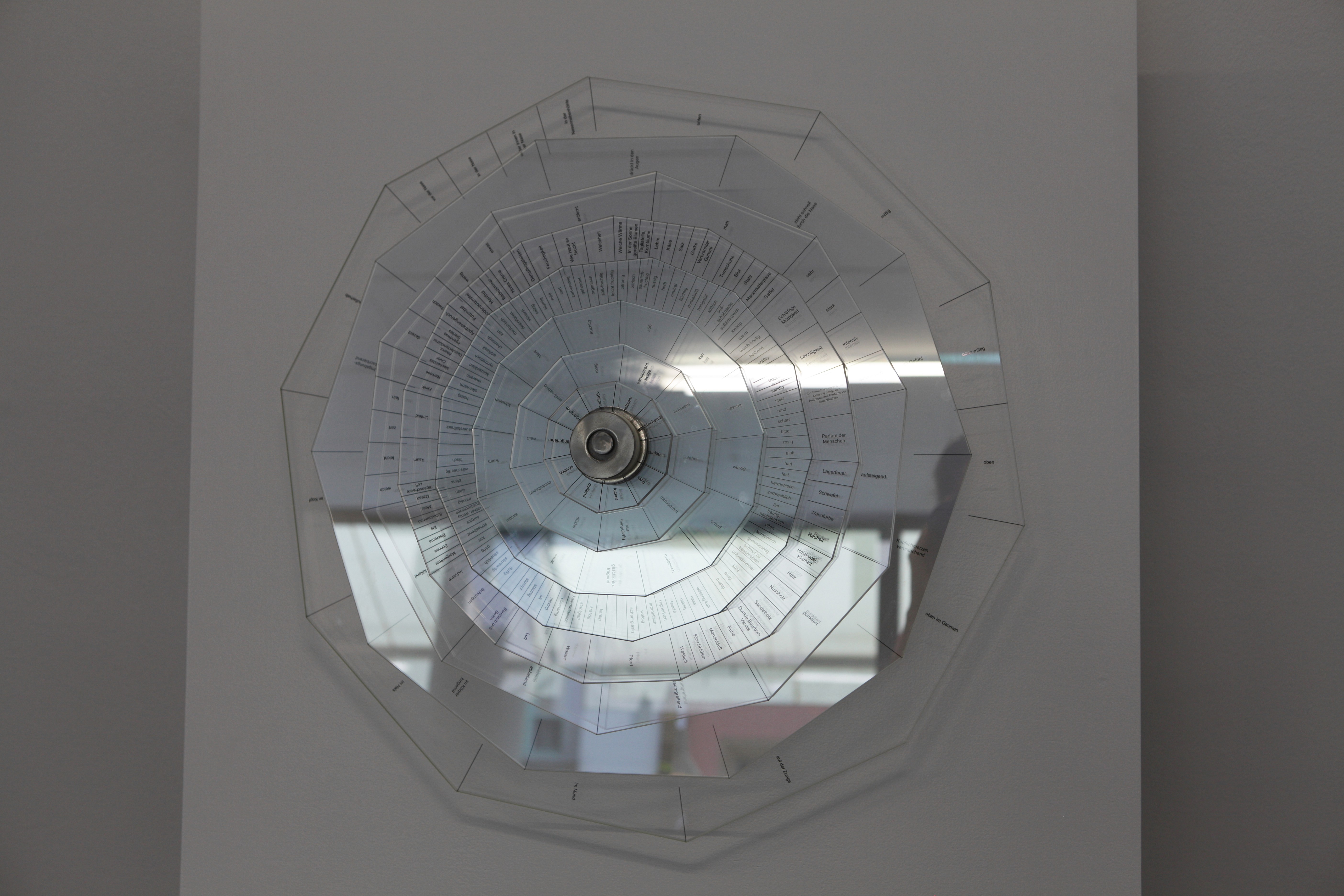 The participants’ descriptions were analyzed and organized into nine categories, ranging from the hedonic qualities of the imagined smells to their perceived spatial location. Each category is further structured into related semantic fields. These categories are materialized as UV-printed dichroic glass panels that can be rotated, allowing for readability and interaction. The slightly mirror-like surface of the dichroic glass metaphorically reflects the participant’s own perception and imagination. Through this interaction, the work proposes new suggestions of what might be smelled through glass, potentially evoking new olfactory experiences in the embodied mind.